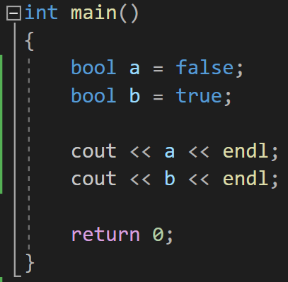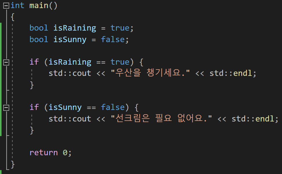 위 예제에서 보듯 false는 0, true는 1를 반환하는 걸 보실수가 있습니다. 이후 조건문에서 더 알아보겠지만 간단한 예제를 통해 bool이 어떻게 사용되는지 알아보겠습니다.